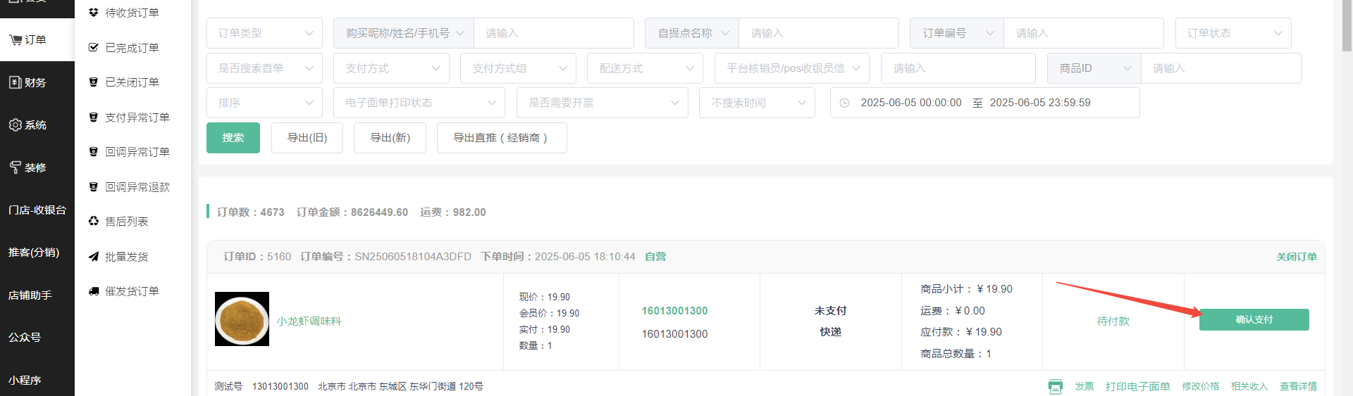 14、第十四步,返回商城的订单列表找到该笔确认支付,对应产生的分润在对应的分润插件查看