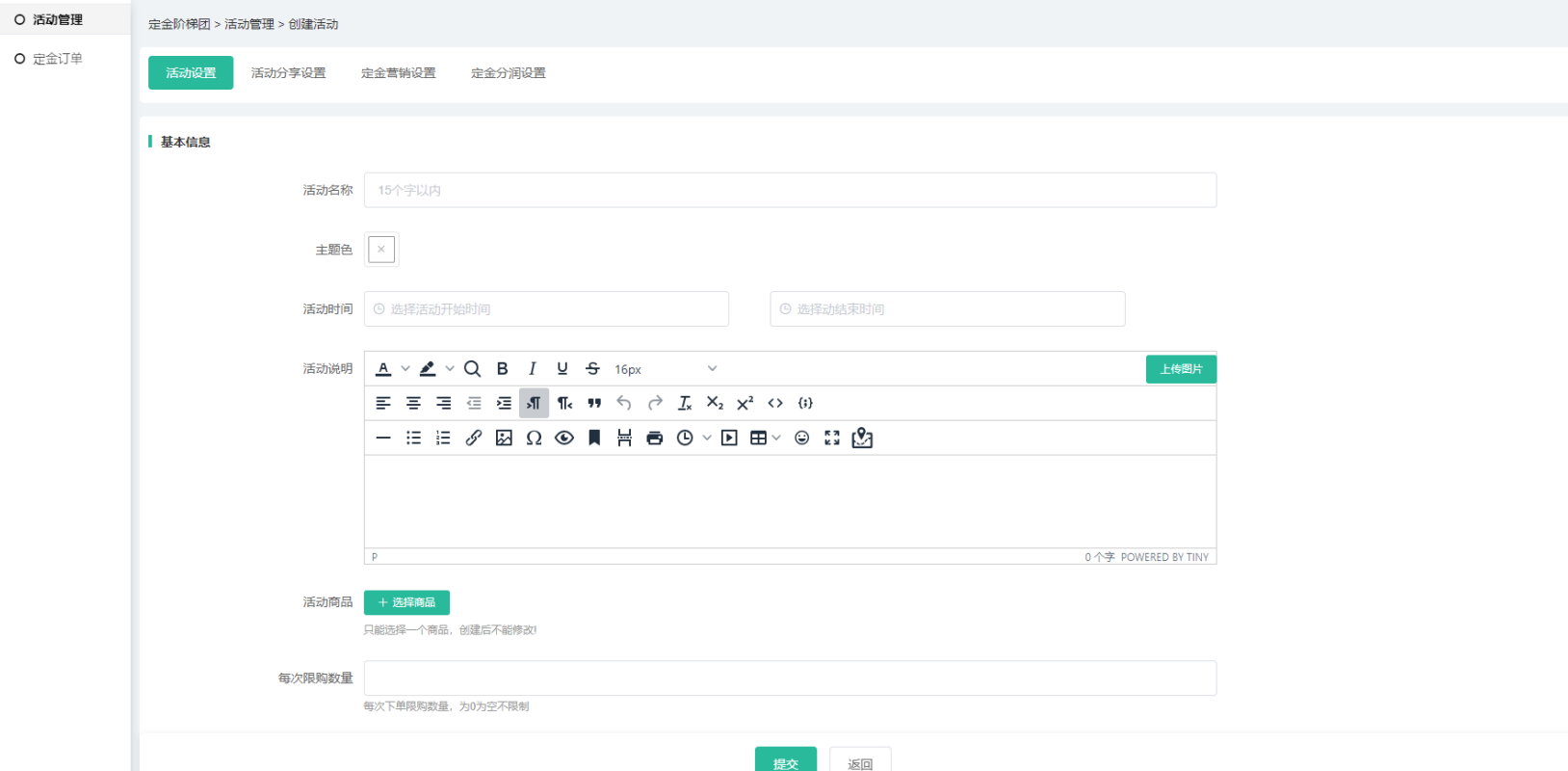 (4)营销设置和分润可设置活动定金的营销及分润信息,相应插件如未开启,则无法     设置,分润中所有插件都没开启则不会有分润设置导航;