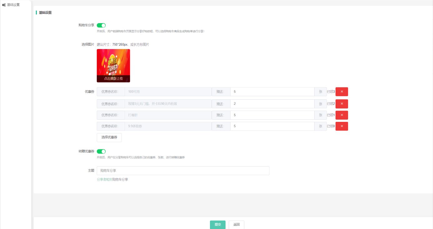 转赠优惠券:开启后,用户在分享购物车可以选择自己的优惠券(会员自己领取的所有平台优惠券)、张数、进行转赠优惠券